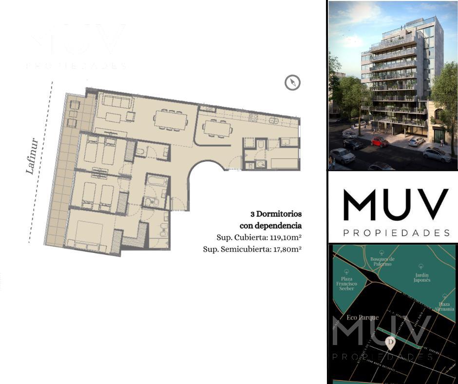 El departamento se encuentra ubicado al frente con vista sobre la calle Lafinur, cuenta con entrada principal y de servicio. Amplio living comedor con salida al balcón corrido, toilette de recepción y espacio de guardado. Cocina independiente de buenas dimensiones, paredes revestidas, anafe y horno eléctrico, con muebles bajo mesada, alacenas, mesadas de cocina de granito o cuarzo. Bacha de acero inoxidable y grifería cromada de primera calidad. Espacio de comedor diario, y conexión para lavarropas. Dependencia de servicio con baño. Dormitorio principal en suite con vestidor. Dos dormitorios con amplios placares. Todos los dormitorios tienen salida al balcón corrido. Segundo Baño completo. Artefactos sanitarios marca Roca o Ferrum. Calefacción por losa radiante. Se entrega con pisos de porcelanato de primera calidad y pre instalaciones listas para equipos de aire acondicionado tipo split frío/calor. El edificio contará con Grupo electrógeno, Seguridad 24hs, SUM, Rooftop con parrilla, Gimnasio, Piscina Descubierta, Solarium, Bike Parking. Apto Blanqueo. Cocheras disponibles en el edificio. Cocheras con entrada por montacarga disponibles en el edificio. Consultar por otras unidades disponibles. Nota: Las medidas y superficies son aproximadas. Las definitivas surgirán de la escritura traslativa de dominio.