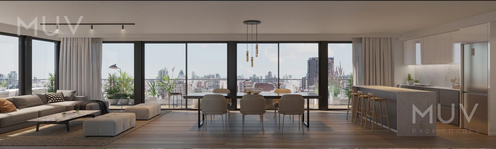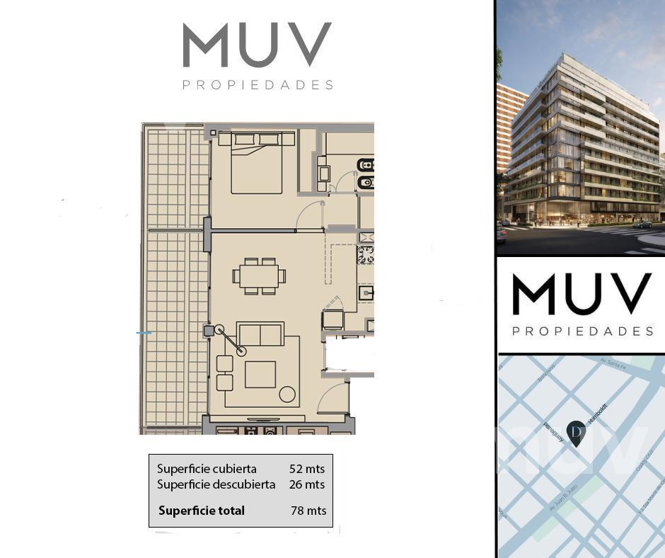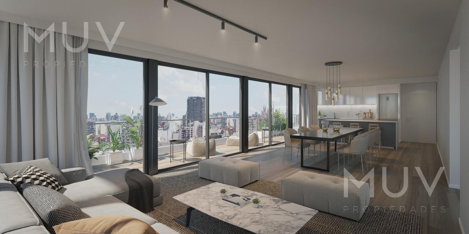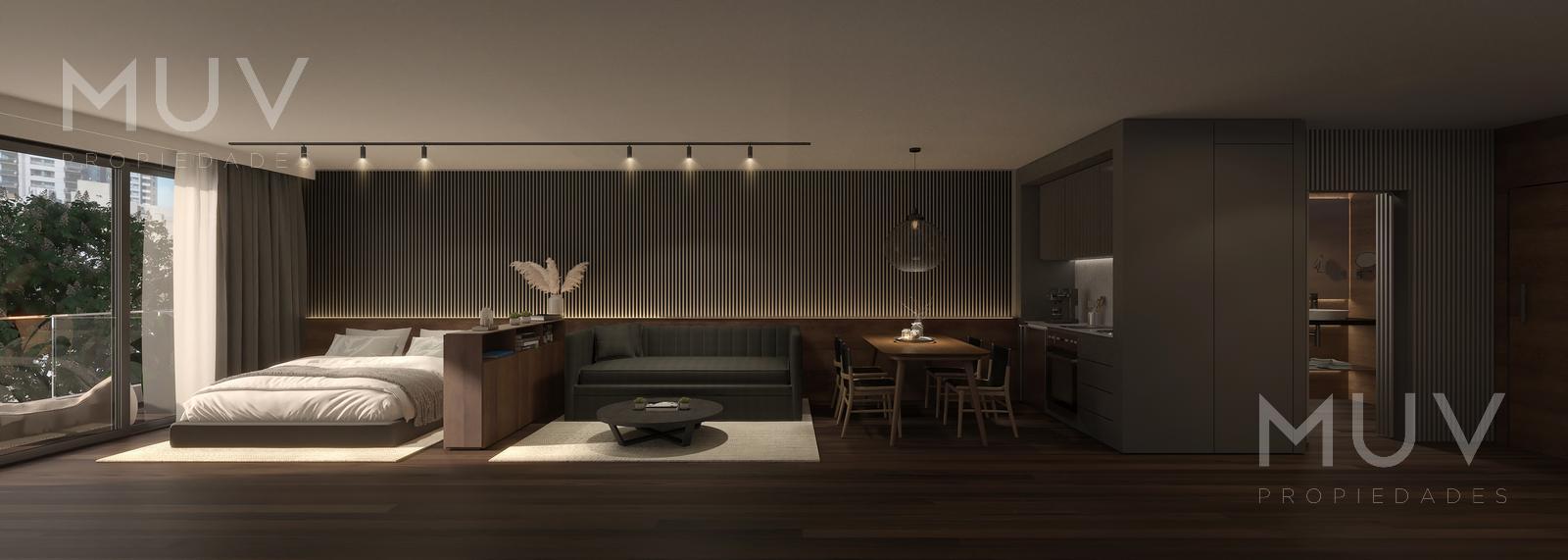 Departamento de 2 ambientes con cómoda área de living comedor y salida a la terraza, con cocina integrada con barra desayunadora, con anafe y horno eléctrico, muebles bajo mesada y alacenas, mesadas de cuarzo bacha de acero inoxidable marca Johnson o similar y grifería monocomando FV, Roca o similar. Toilette de Recepción. Dormitorio en suite con amplio vestidor y salida a la terraza. Los baños contarán con artefactos sanitarios marca Roca o Ferrum y pre instalación para extractor. Se entrega con pre instalaciones listas para sistemas de aire acondicionado tipo Split frío/calor. Calefacción por piso radiante con control de temperatura por termostato en cada ambiente. Agua caliente central. Apto Profesional. Pisos de porcelanato. El edificio cuenta con las siguientes amenities: Gimnasio con área fitness, SUM, área de parrillas, Laundry, Piletas descubiertas con Solarium, Bike Parking, Smart Lockers, Seguridad 24hs. Cocheras disponibles Opcional (Consultar VALOR!!!). Entrega pautada para el último trimestre de 2027. Comercializa Muv Propiedades. Desarrolla y construye ADN Developers. Nota: Las medidas y superficies son aproximadas. Las definitivas surgirán de la escritura traslativa de dominio.
