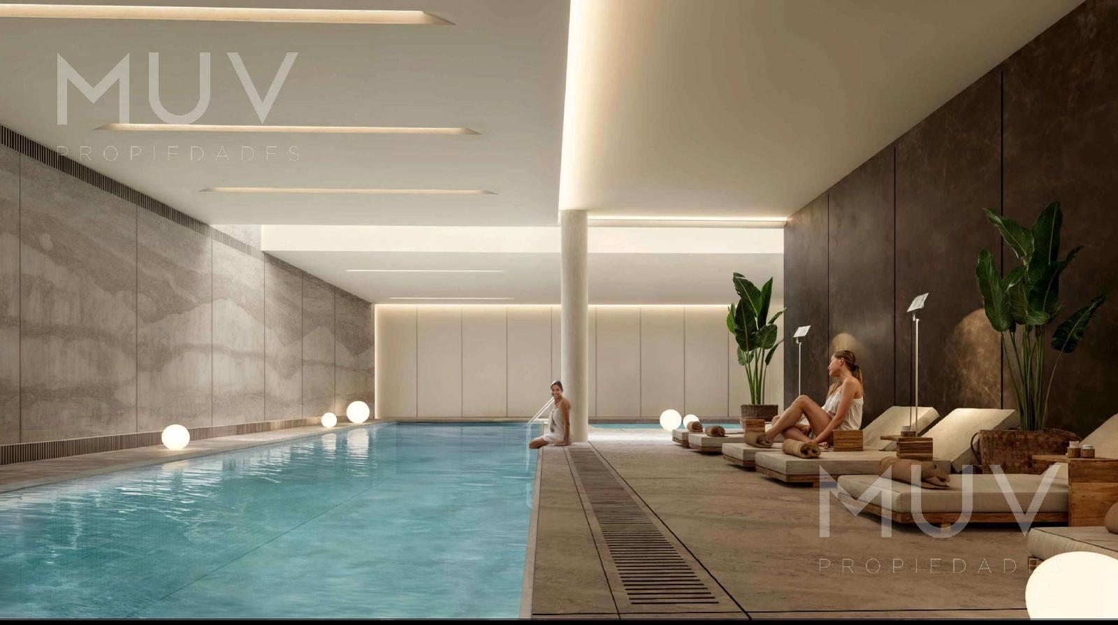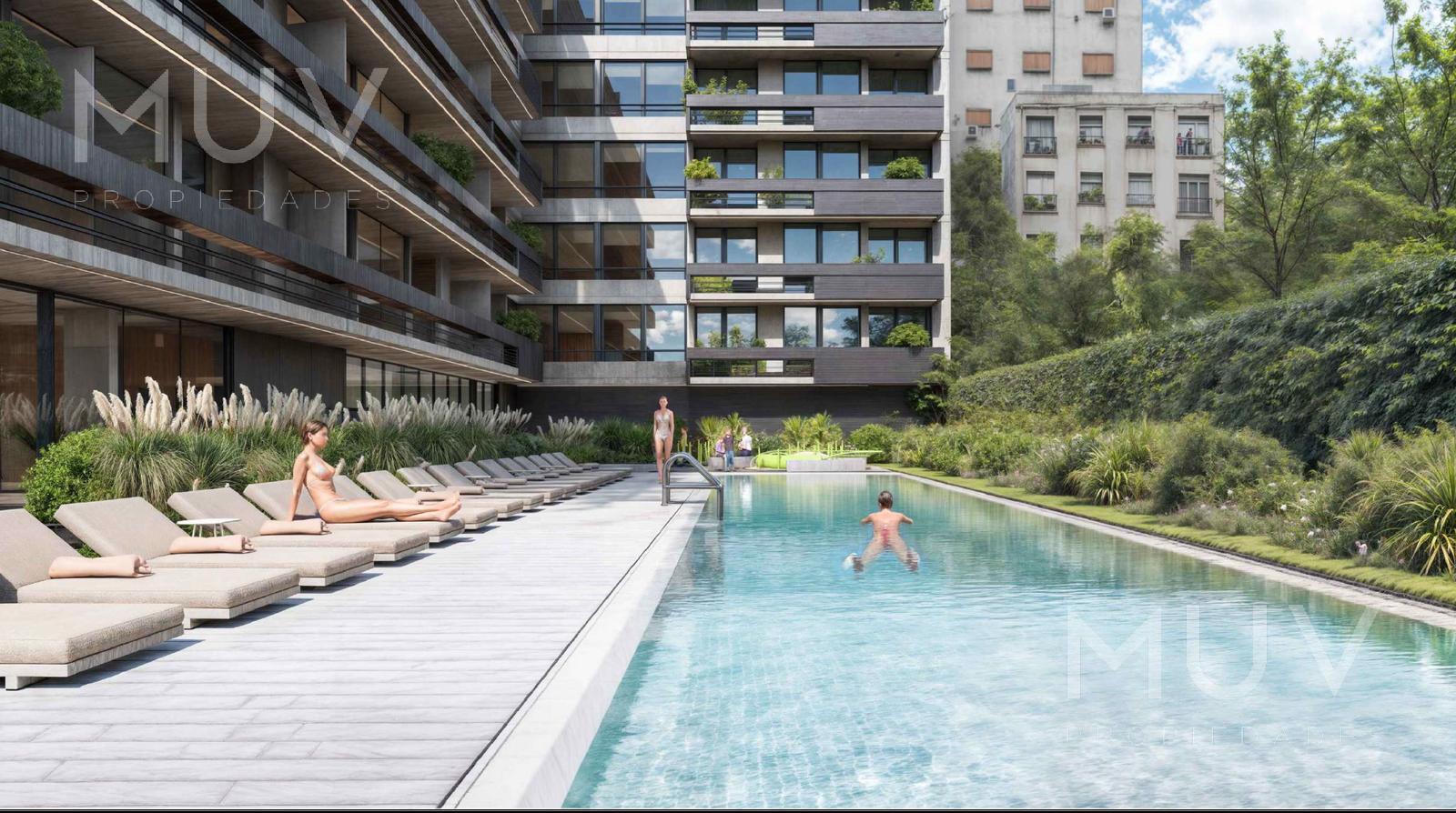 En PB se encuentran las amenities, gimnasio equipado, salón de usos múltiples, pileta semiólimpica, piscina y piscina para niños, solárium, sauna, sala de masajes, espacio de relax, parrillas, juego para niños, duchas, vestuarios y laundry.