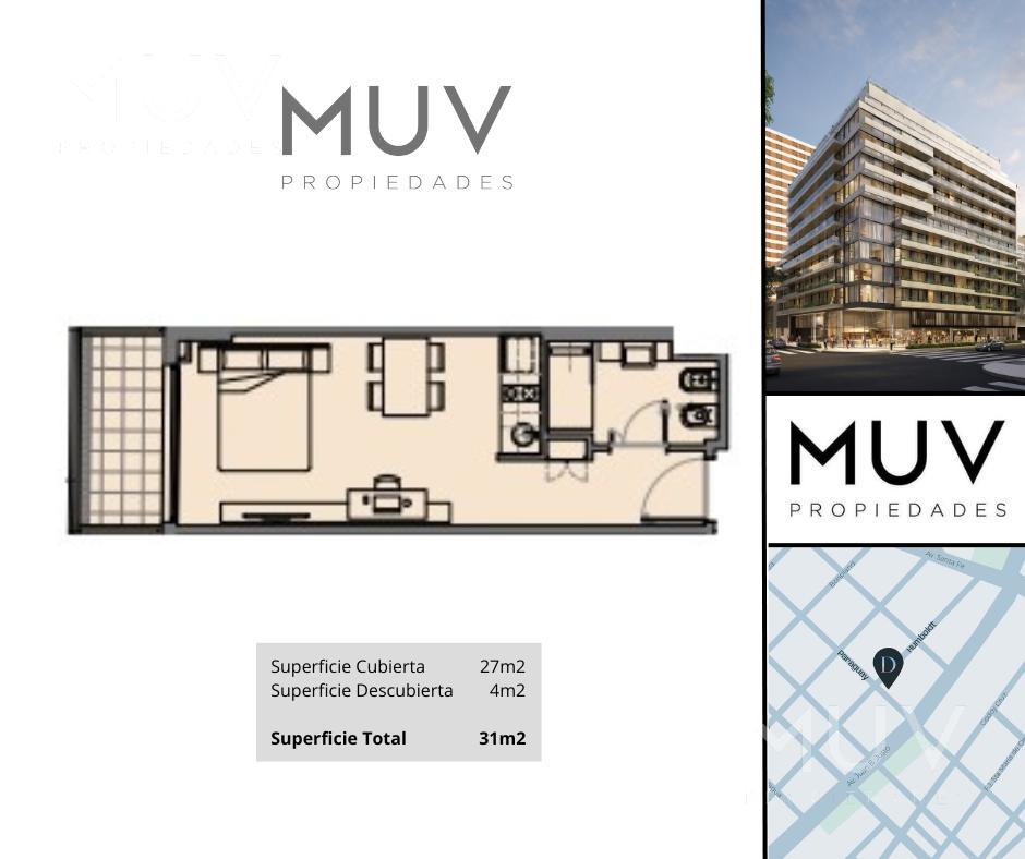 Departamento monoambiente al frente sobre la calle Humboldt. Contará con cocina integrada con anafe y horno eléctrico, muebles bajo mesada y alacenas, mesadas de cuarzo bacha de acero inoxidable marca Johnson o similar y grifería monocomando FV, Roca o similar. Baño completo con artefactos sanitarios marca Roca o Ferrum y pre instalación para extractor. Se entrega con pre instalaciones listas para sistemas de aire acondicionado tipo Split frío/calor. Calefacción por piso radiante con control de temperatura por termostato en cada ambiente. Agua caliente central. Apto Profesional. Pisos de porcelanato. El edificio cuenta con las siguientes amenities: Gimnasio con área fitness, SUM, área de parrillas, Laundry, Piletas descubiertas con Solarium, Bike Parking, Smart Lockers, Seguridad 24hs. Cocheras disponibles Opcional (Consultar VALOR!!!). Entrega pautada para el último trimestre de 2027. Comercializa Muv Propiedades. Desarrolla y construye ADN Developers. Nota: Las medidas y superficies son aproximadas. Las definitivas surgirán de la escritura traslativa de dominio.